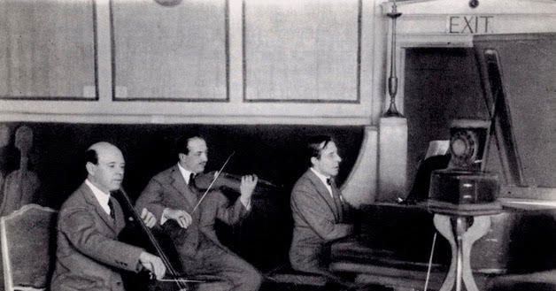 Alfred Cortot, Jacques Thibaud y Pau Casals grabando en Londres en 1927 © EEMM