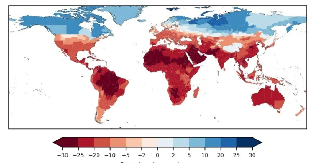 Cambios proyectados en los ingresos en 2049 en comparación con una economía sin cambio climático. © 2025 by Kotz et al., Nature